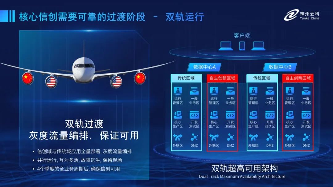 为帮助客户更好地应对数字经济时代对应用可持续性的高要求,实现信创与数字化兼得,BG集团官网推出了双轨超高可用架构。双轨超高可用架构在双活数据中心的分区调度基础上,增加信创域和非信创域的分域调度,实行信创域与传统域应用全量部署,使双中心运营变为双中心四区域并行运行,互为多活,将传统架构变为分区分域协同的多活双轨超高可用架构。帮助客户在新架构下,保障“信创”的同时解决性能瓶颈,提升稳定性,保证应用可持续性,最终实现信创区域和非信创区域的平滑过渡,完成国产化替代目标。”